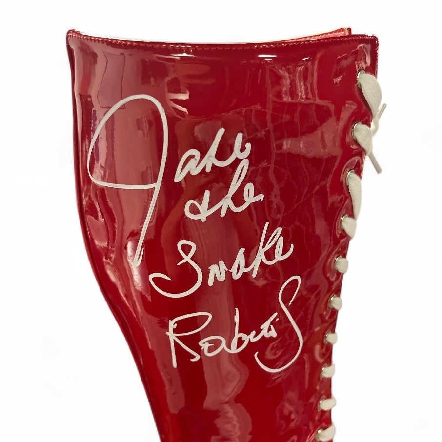 Jake “The Snake” Roberts is a legendary professional wrestler best known for his psychological style, chilling promos, and his trademark use of live snakes during matches. He was inducted into the WWE Hall of Fame (2014). Jake signed this wrestling boot with a white paint pen.