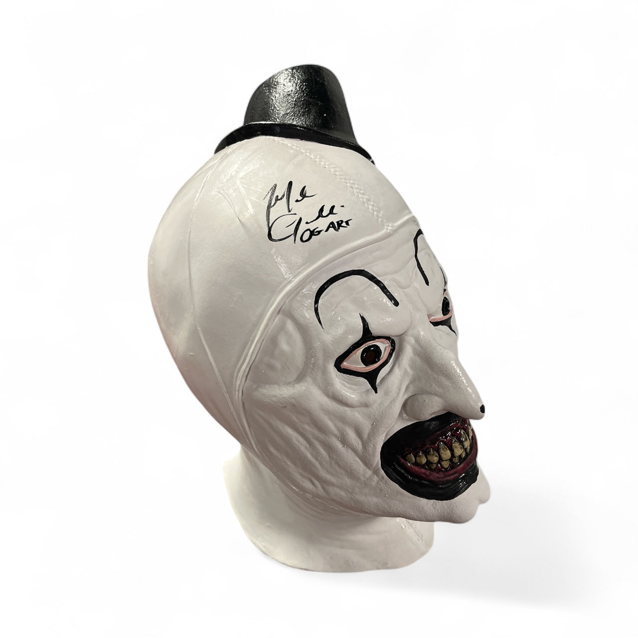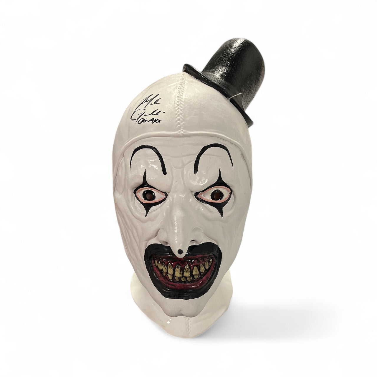 Mike Giannelli is credited as playing Art the Clown in All Hallows’ Eve. Mike Giannelli was the original actor to portray Art the Clown, establishing the physical presence, makeup style, and tone of the character in the early short films and the anthology feature. Mike signed this Art the Clown mask with a black sharpie.