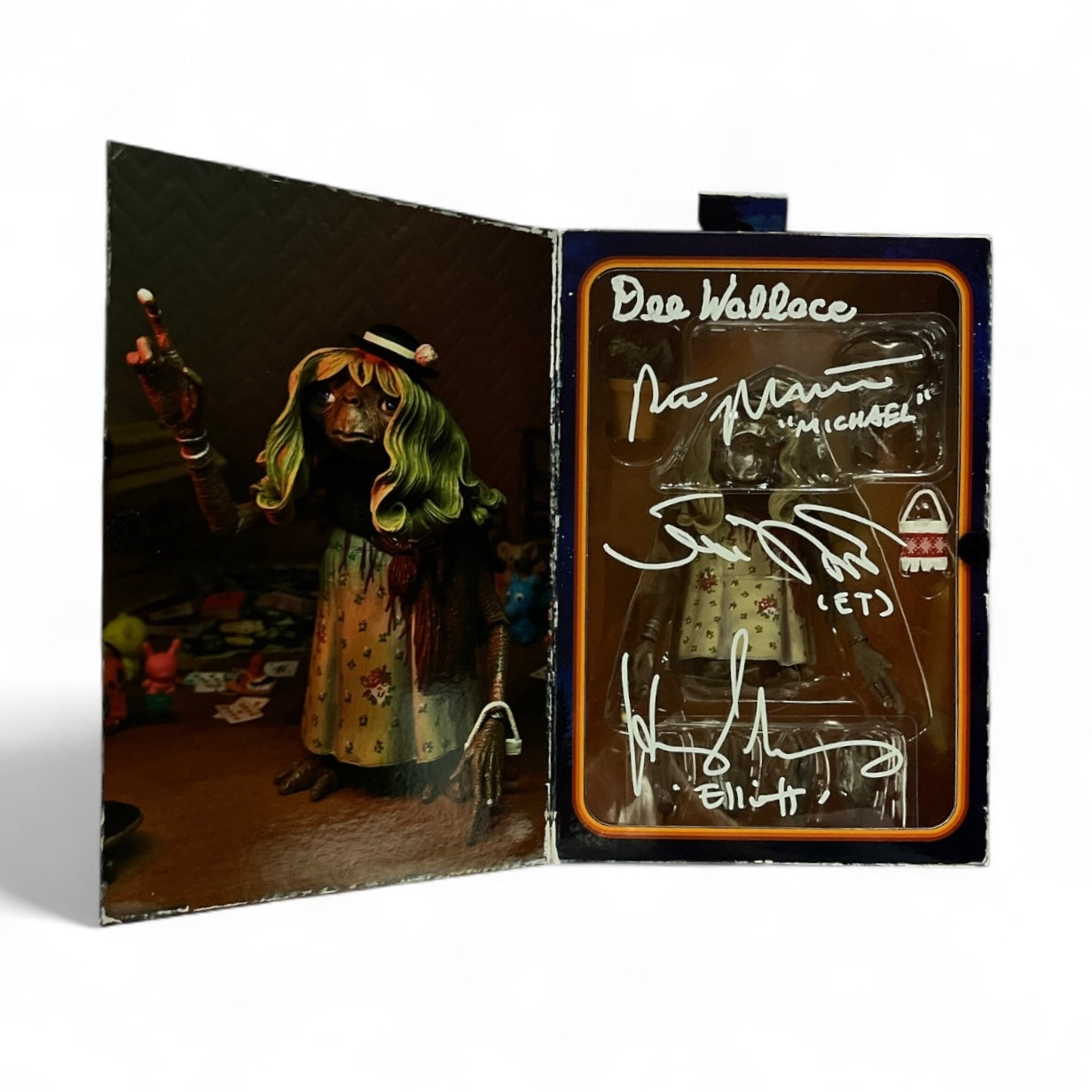 Henry Thomas, Dee Wallace, Matthew De Merit, and Robert MacNaughton were cast members in Steven Spielberg's iconic science fiction movie ET: The Extra-Terrestrial. All actors signed this ET figure with a white paint pen.